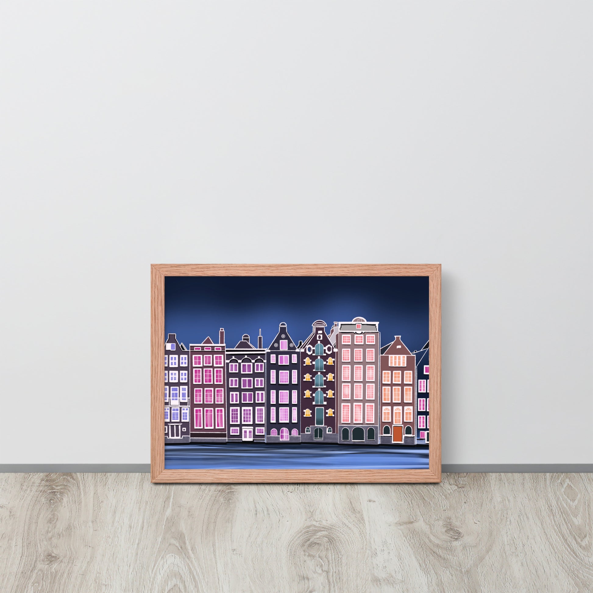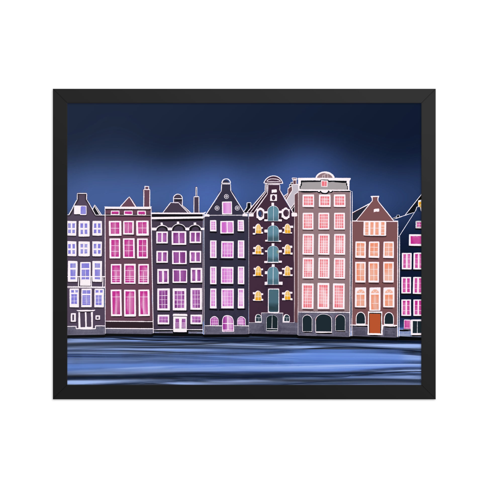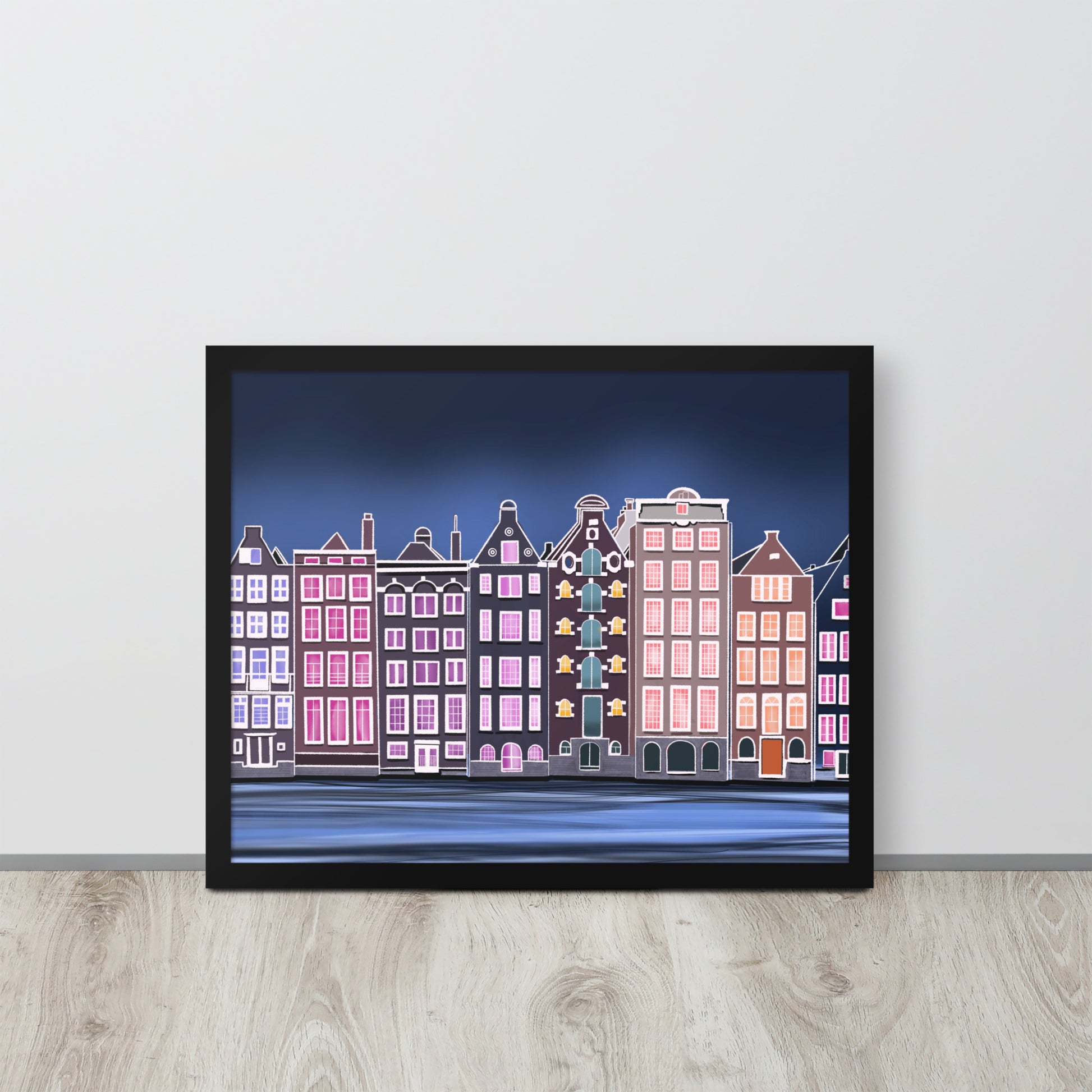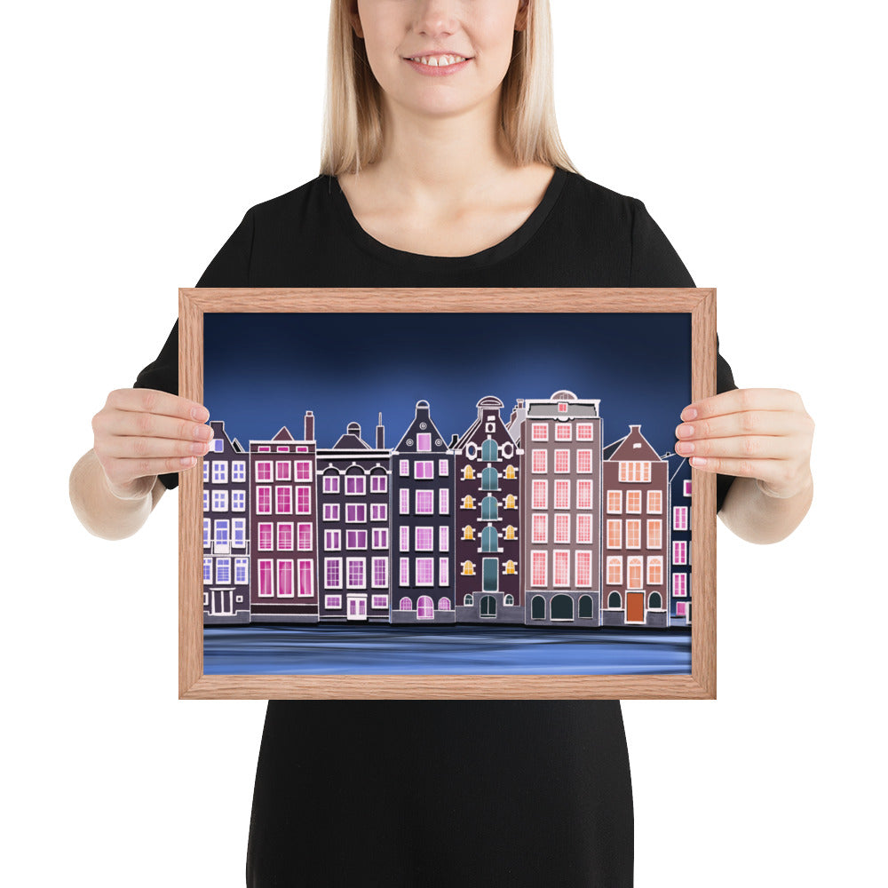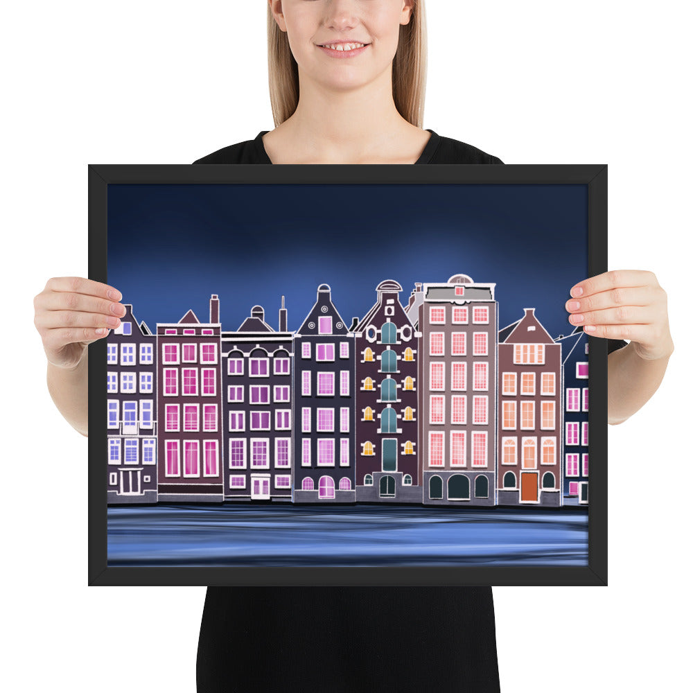 Amsterdam Night Scene - Vibrant Hand-Painted European Architecture Framed Poster