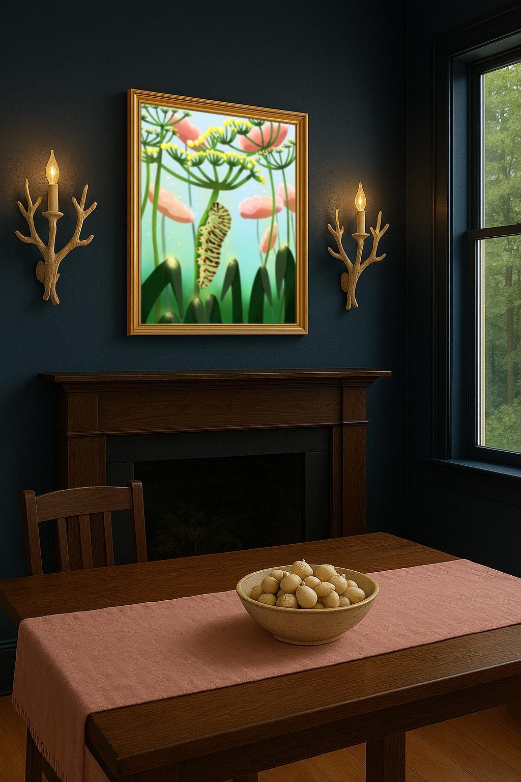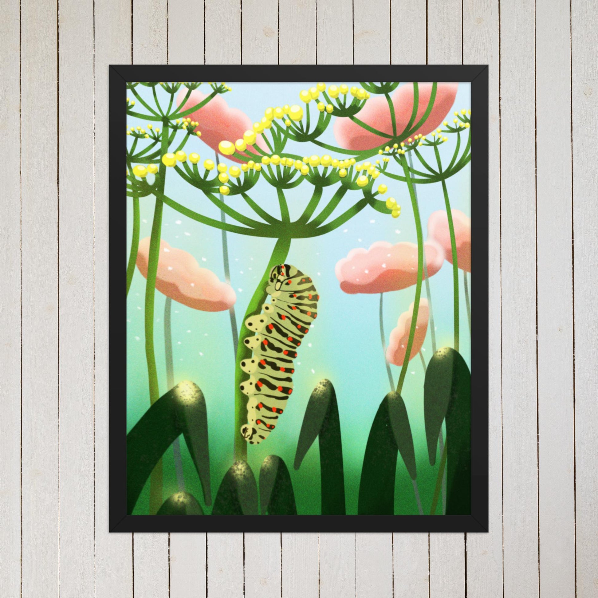 Bring a touch of wonder to your walls with this hand-painted caterpillar art print. Nestled among dreamy botanicals and soft pastel blooms, the caterpillar rests beneath whimsical yellow blossoms in a magical garden scene. The soft color palette and playful composition make this a charming addition to any nature lover’s collection or a delightful piece for a child’s bedroom or nursery.