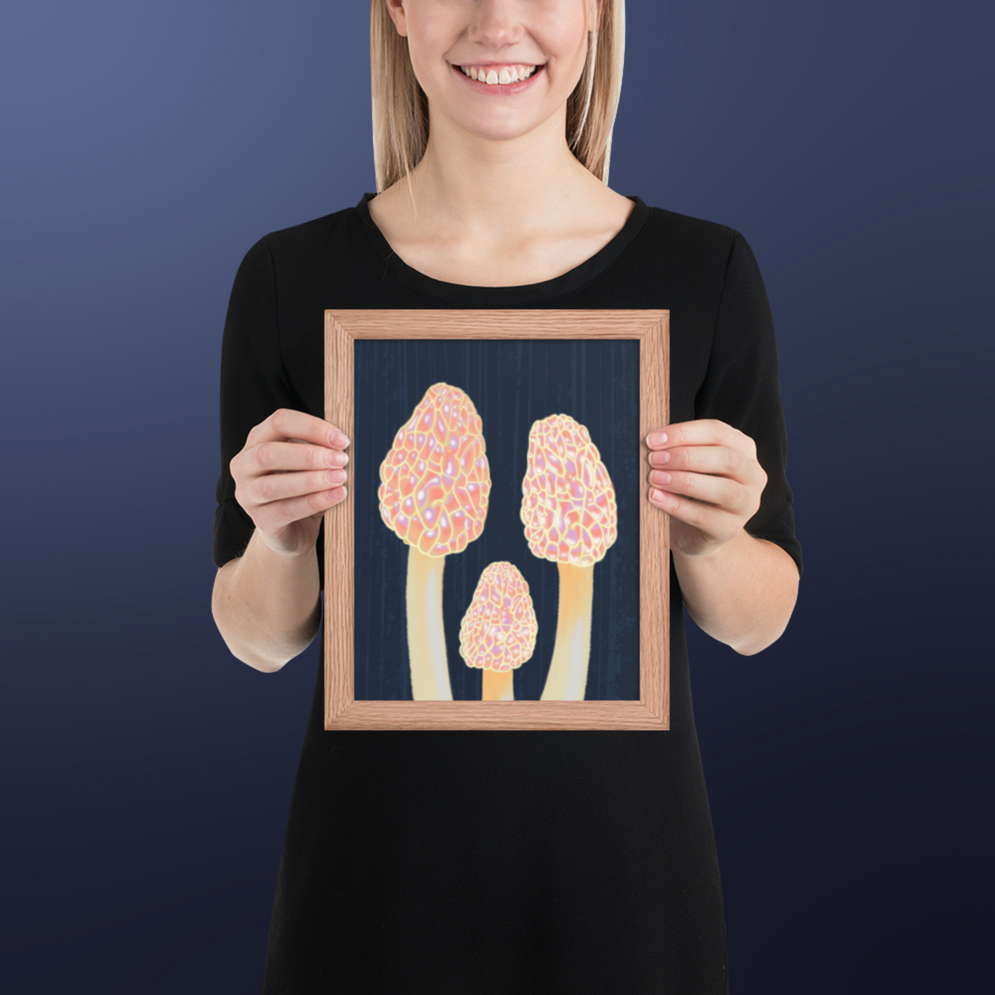 Morel Framed poster - Hand-Painted Morel Mushroom Poster – Pink & Blue Framed Art - Fungi Home Decor