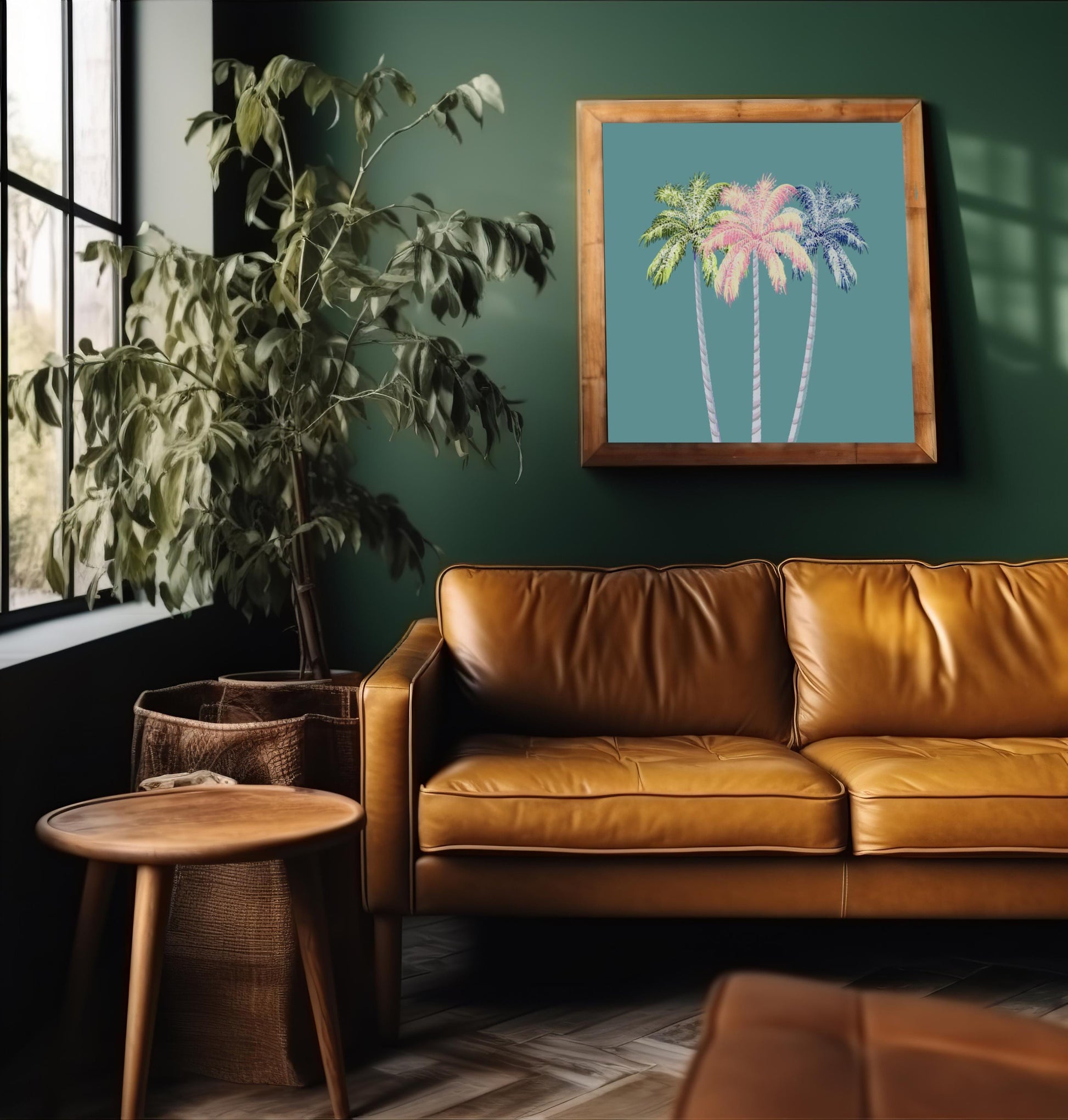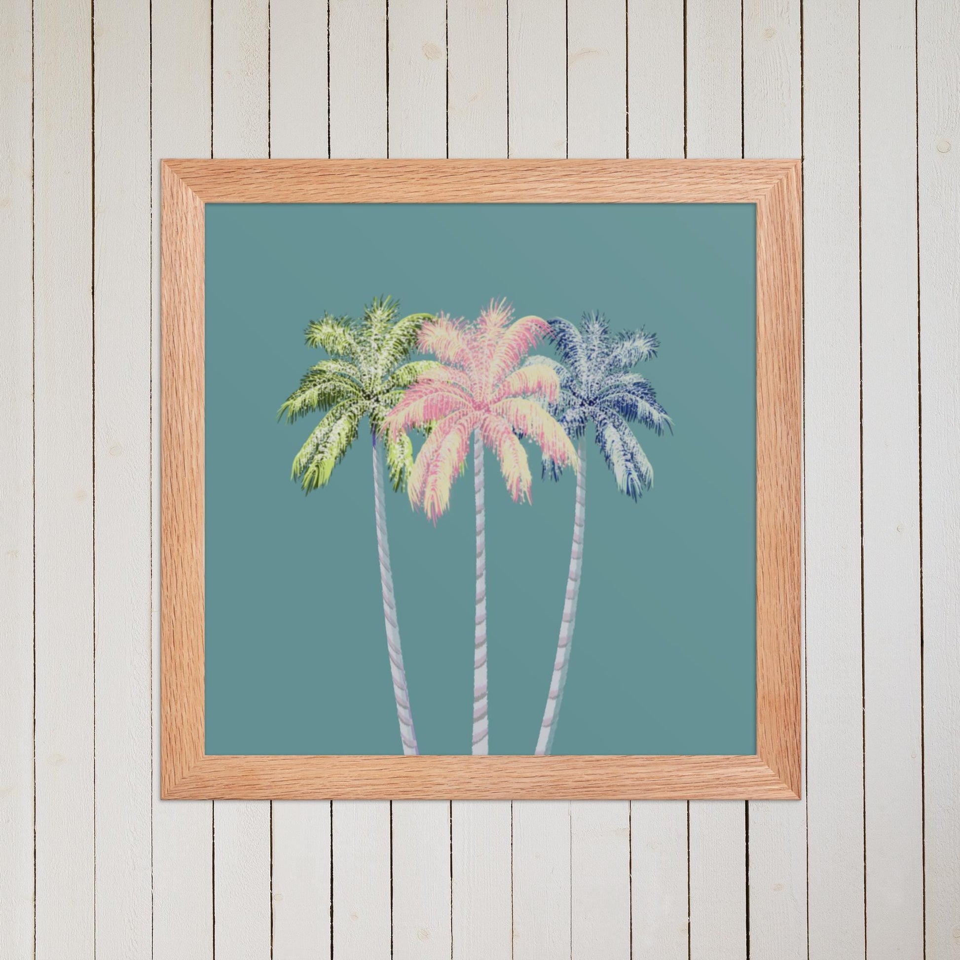 Bring tropical vibes into your space with this whimsical hand painted print featuring three pastel palm trees in pink, green, and blue. Set against a rich, teal background, this vibrant artwork adds a playful yet serene touch to any room. Perfect for beach lovers, coastal décor, or anyone who craves a splash of tropical color. Printed from original hand painted art, this piece is ideal for gallery walls, boho interiors, or as a unique gift.