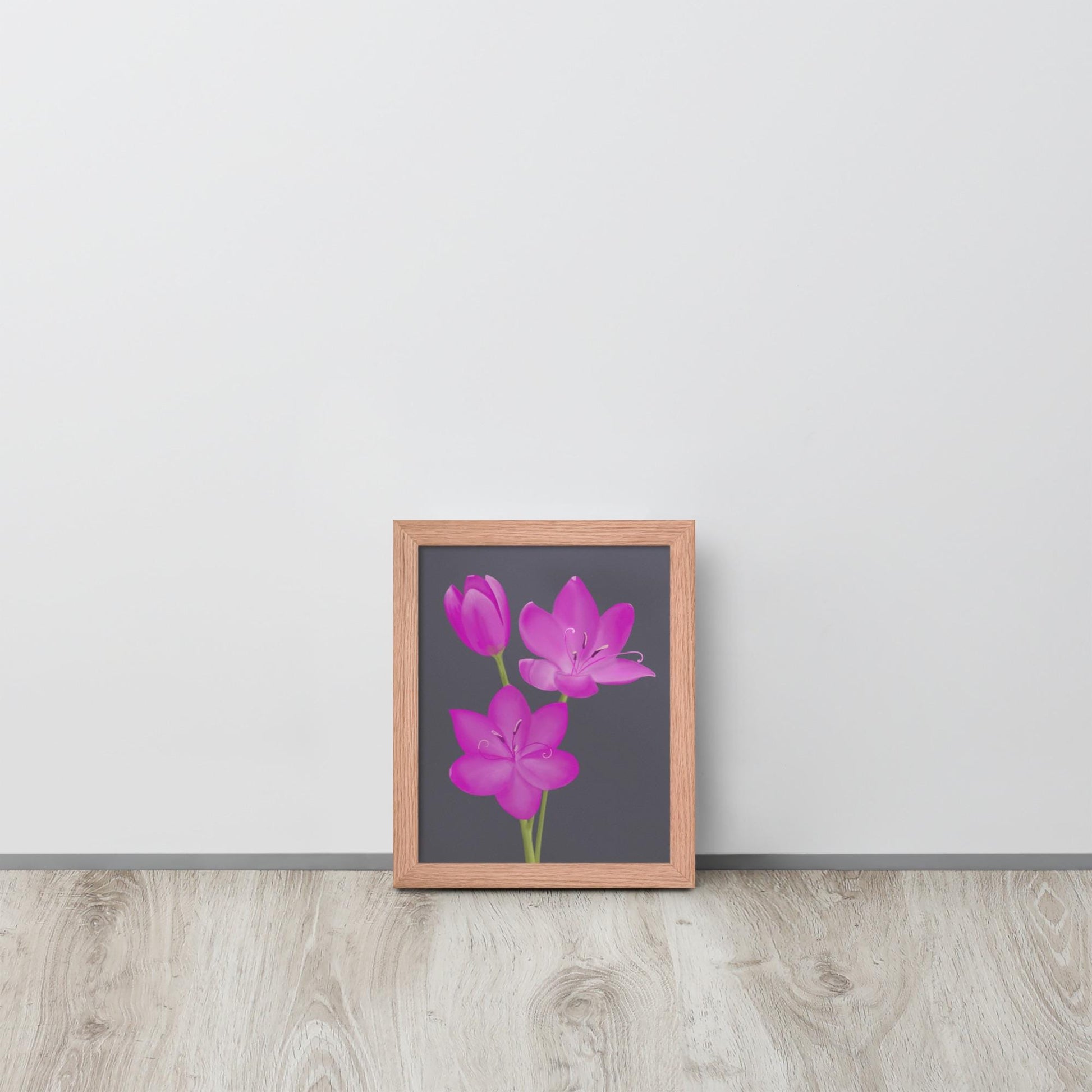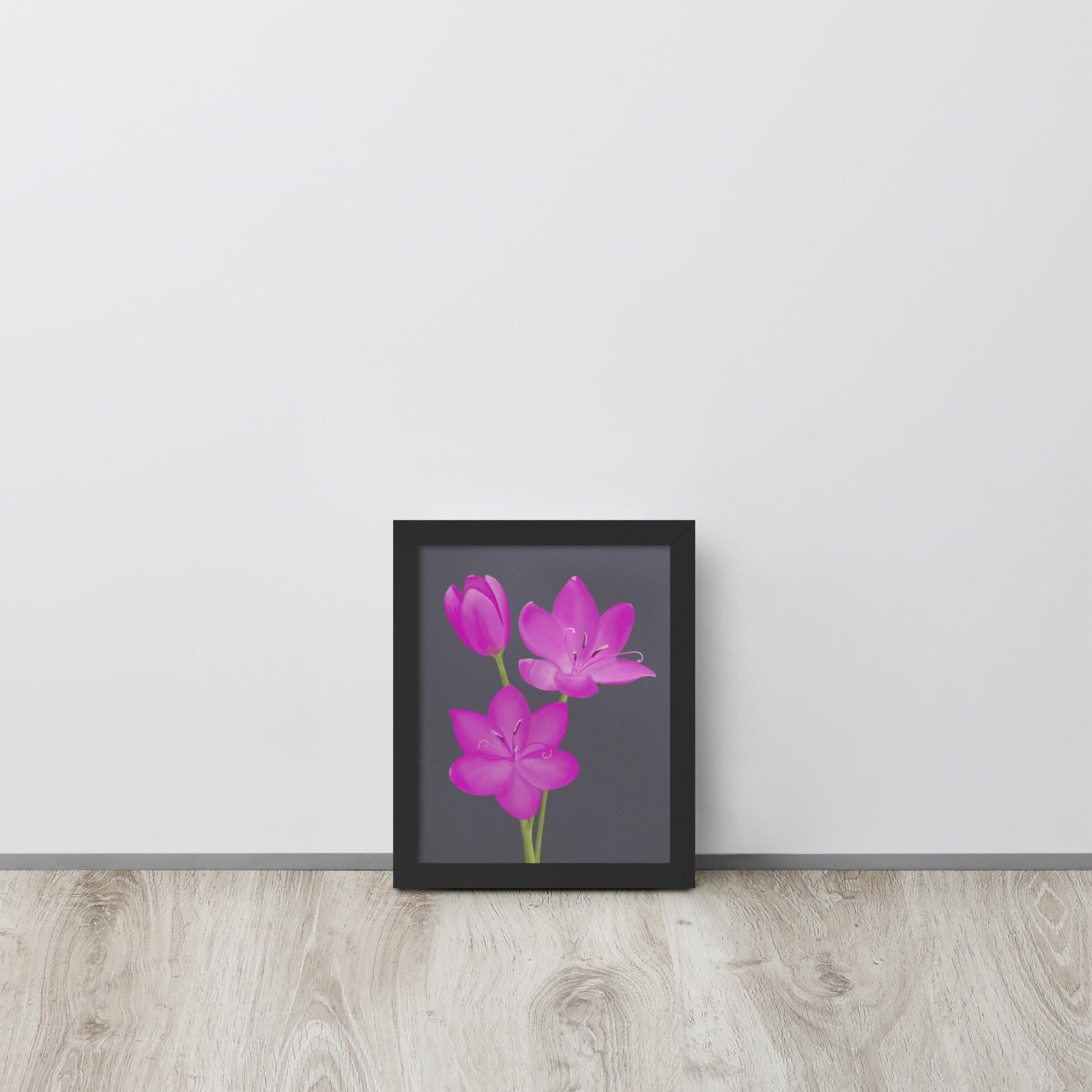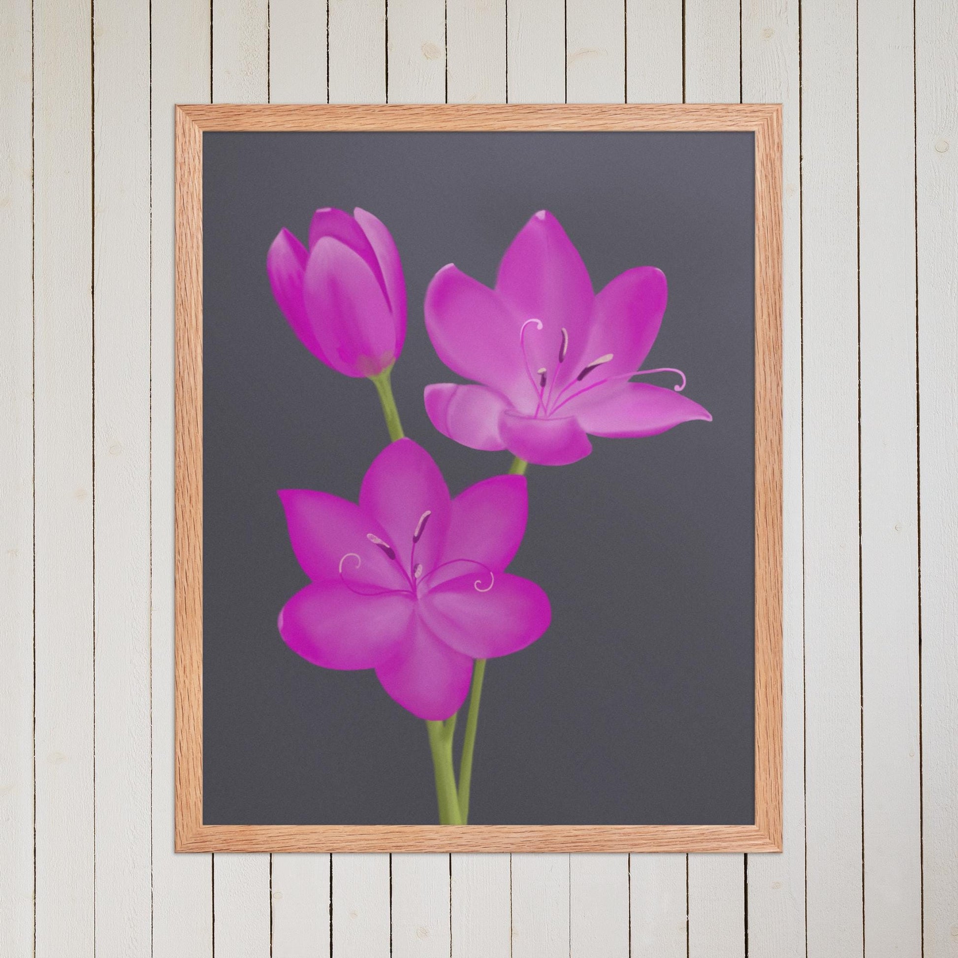 Brighten your space with this hand-painted art print featuring three vivid pink lily blossoms against a deep charcoal background. This floral artwork brings bold elegance and natural charm to any room. Perfect for nature lovers and fans of minimalist botanical decor, it makes a thoughtful gift or standout piece for gallery walls, offices, and bedrooms.
