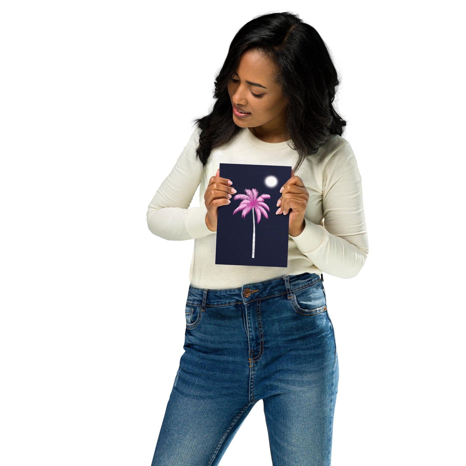 Escape to a dreamy tropical night with this hand-painted art print of a pink palm tree under the glowing moon. Set against a deep navy sky, this whimsical piece adds a splash of color and calm to any space.