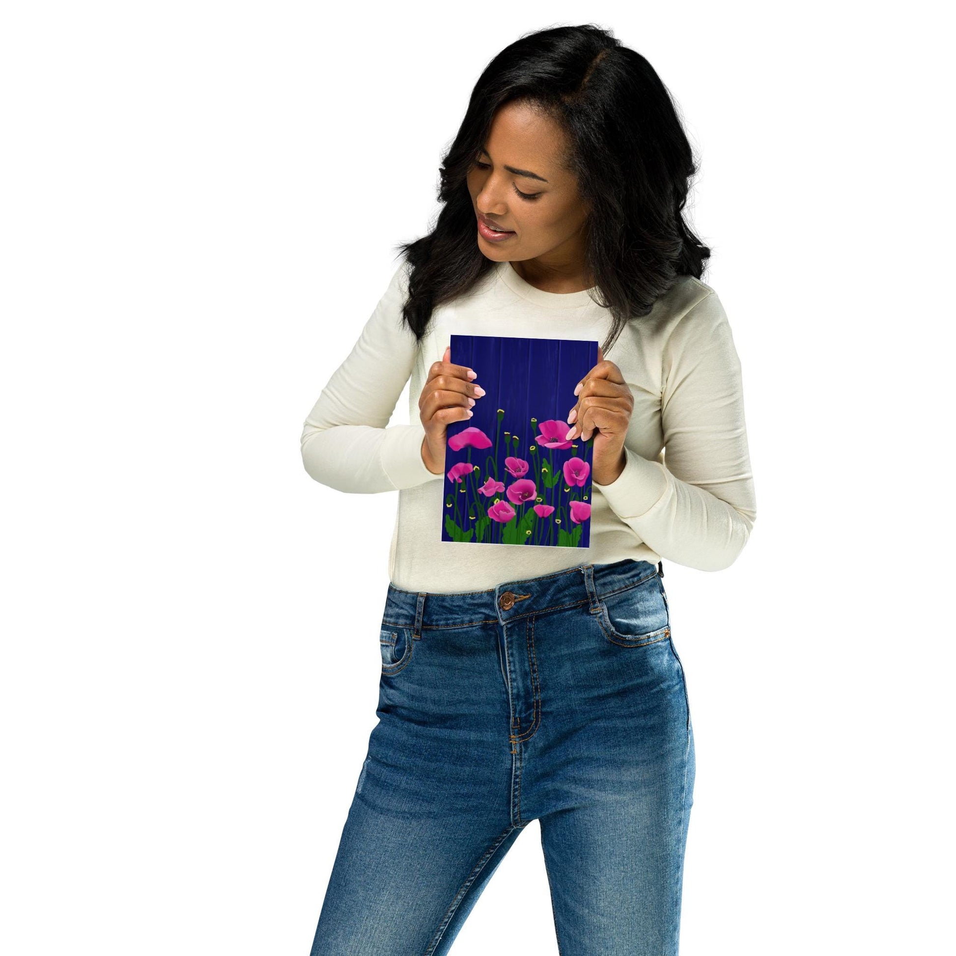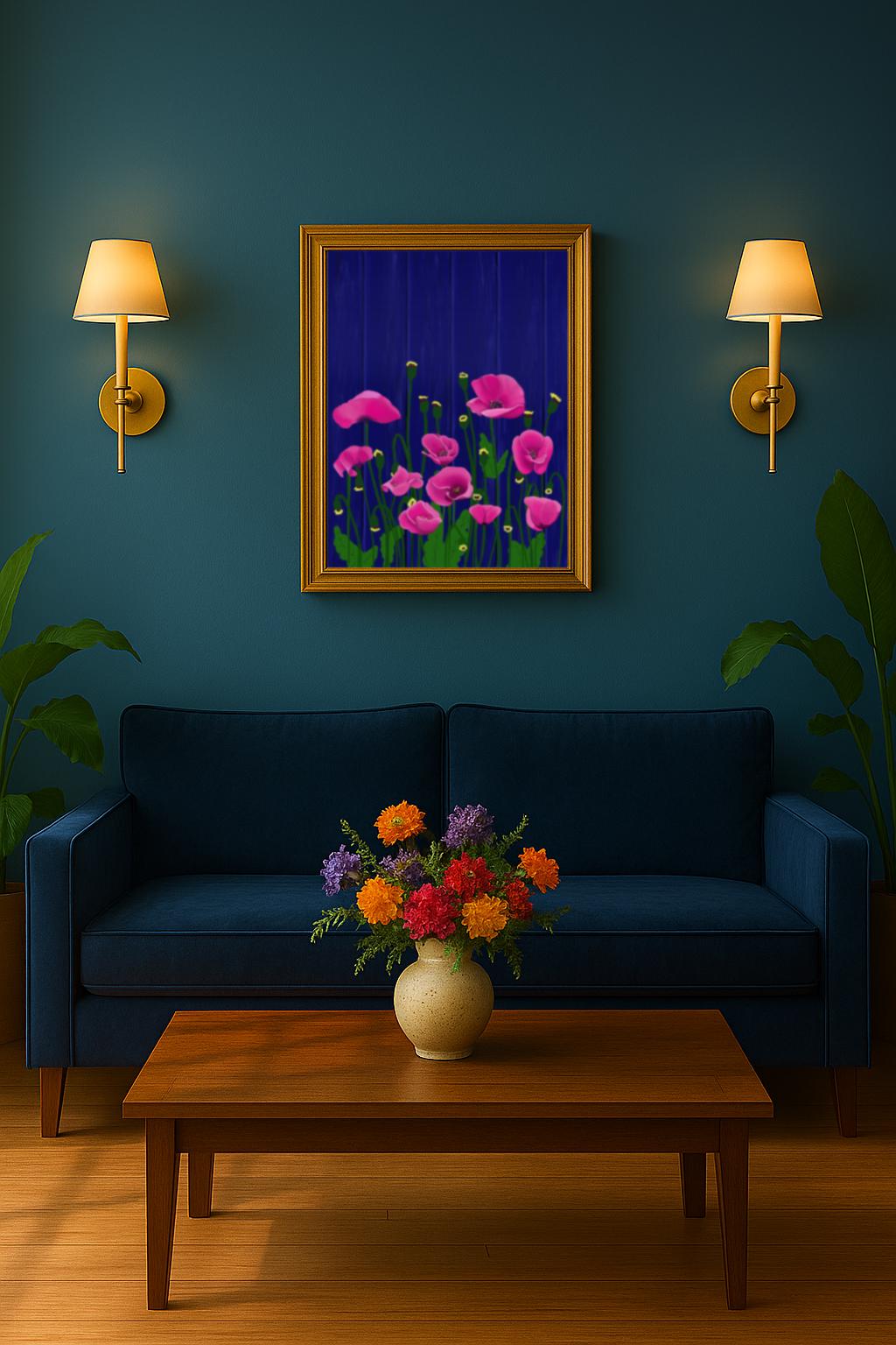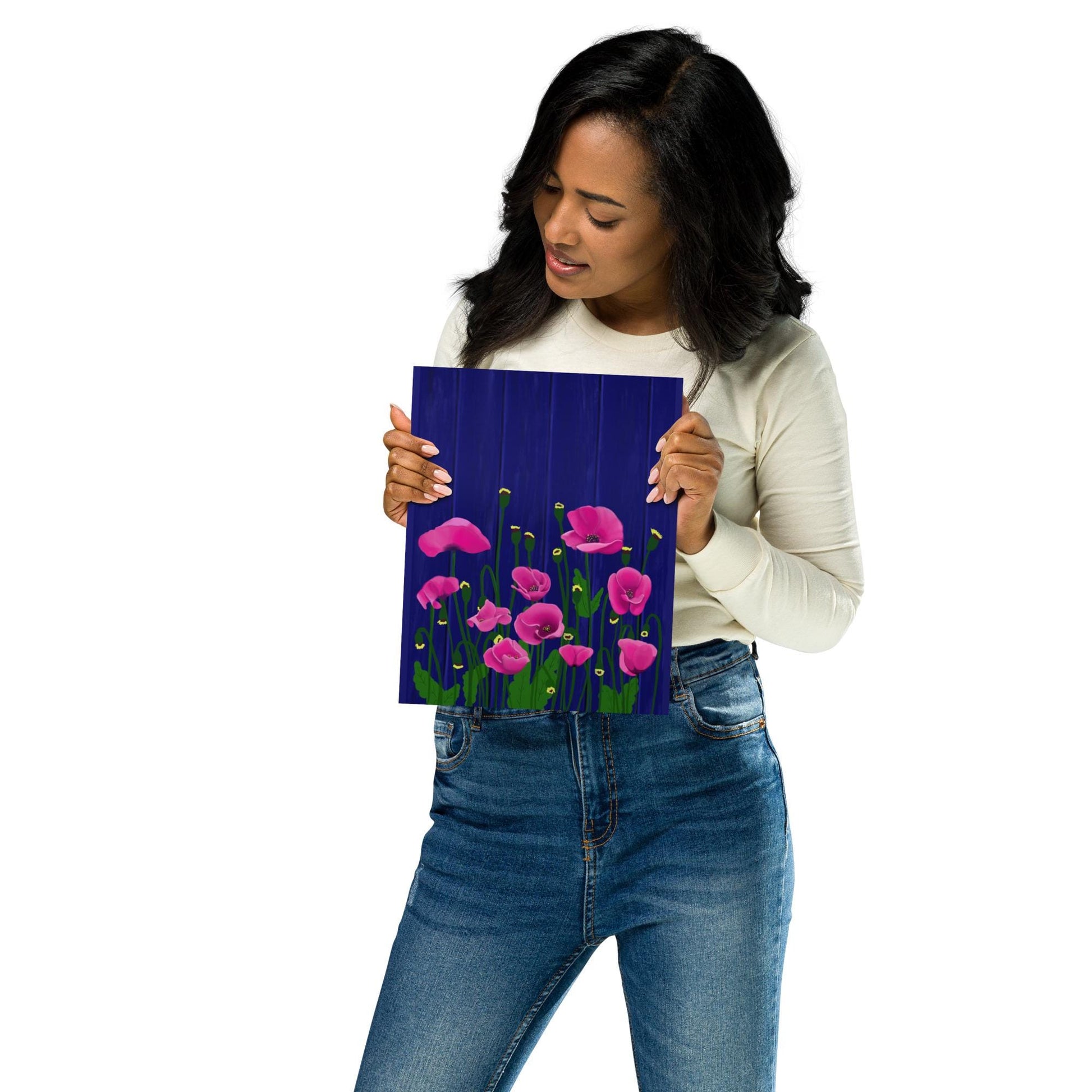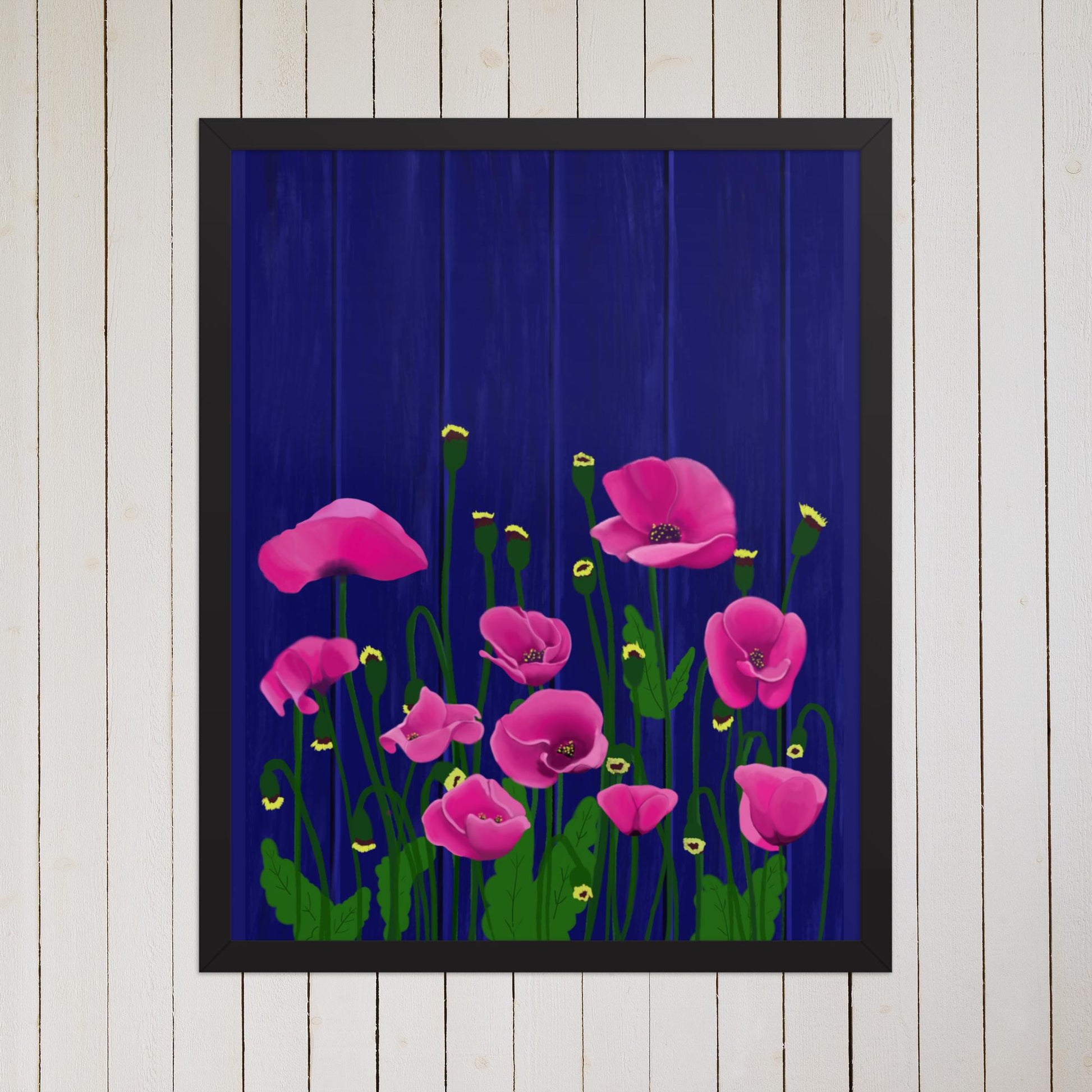 Pink Poppy Garden Art Print: Blue Fence Floral Wall Decor