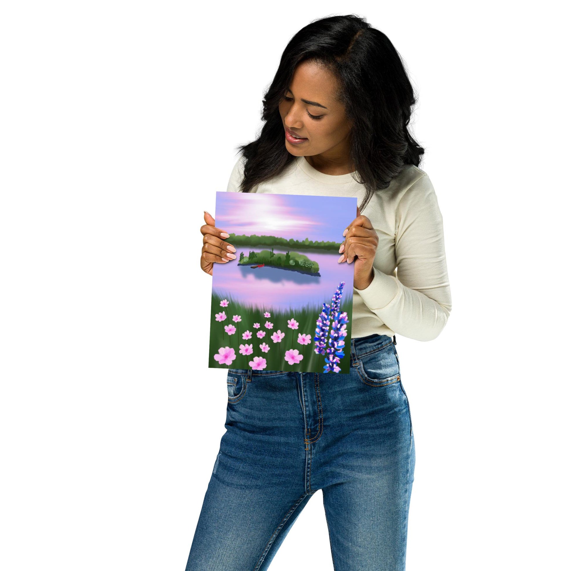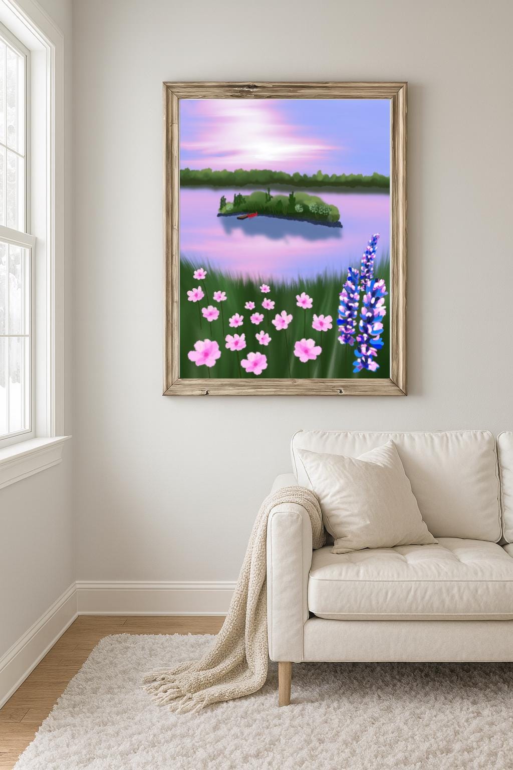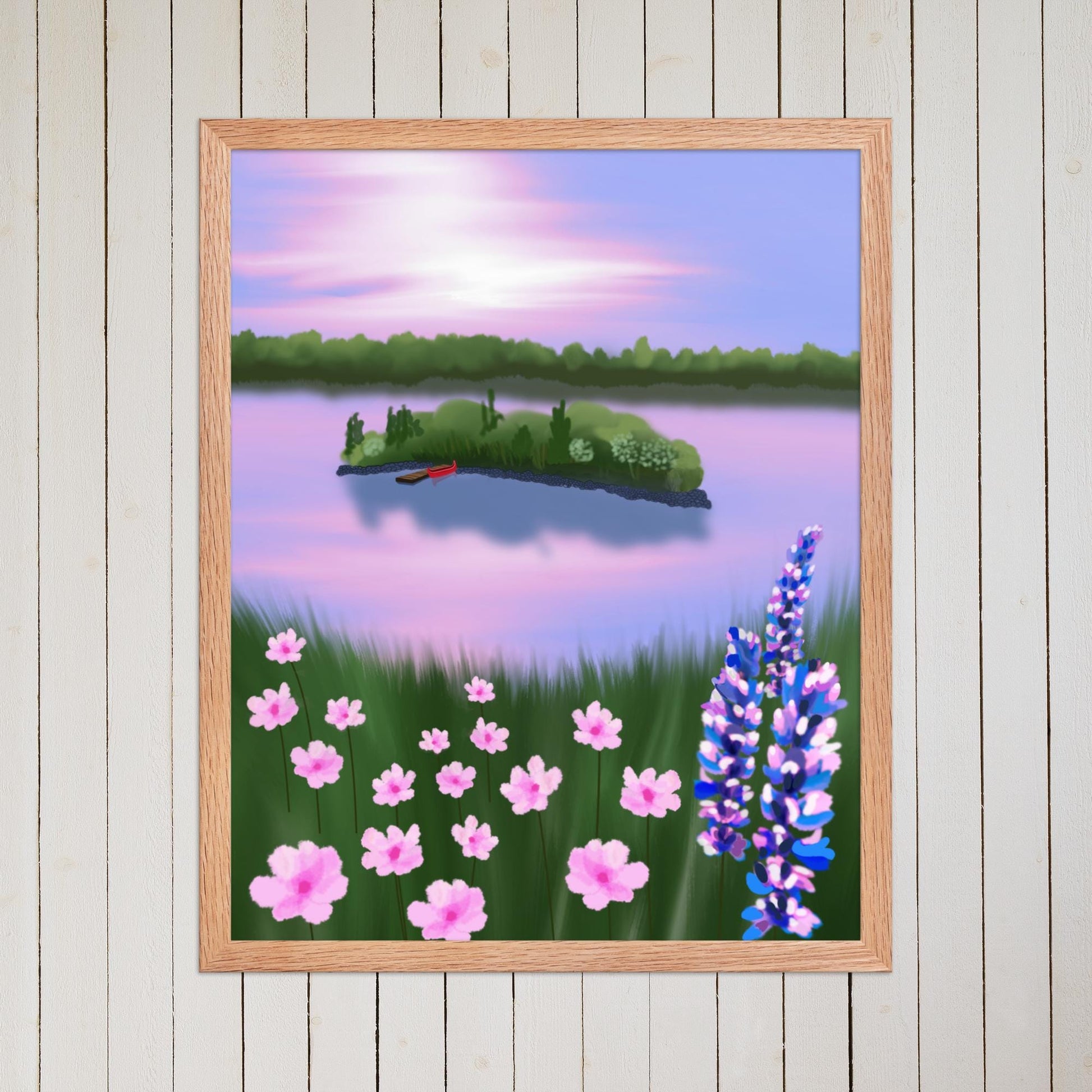 Pink Sky Lake Print: Red Canoe Landscape, Cottage Wall Art