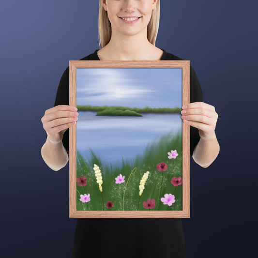 Hand-Painted Lakeshore Summer Landscape | Vibrant Foliage & Flowers | Framed Poster | Nature Wall Art for Home Decor