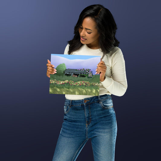 Countryside Landscape Poster with Abandoned Barn, Lilacs, Florals, Flowing Grasses, Sunny Breezy Day, Clouds, and Rustic Fence Decor