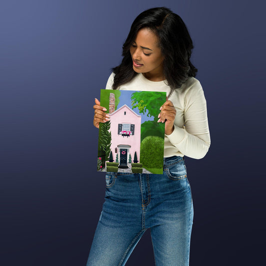 Hand-Painted Stately Pink Home Poster with Green Topiary & Blue Sky